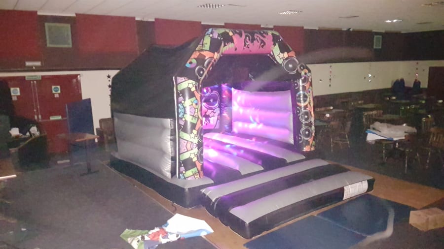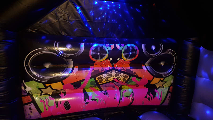 Add a touch of sparkle and sound to your celebration with our Disco & Dance Bouncy Castle! Featuring a stunning silver and black design with unique party-themed artwork, this eye-catching inflatable is perfect for all ages—from energetic kids to fun-loving adults.